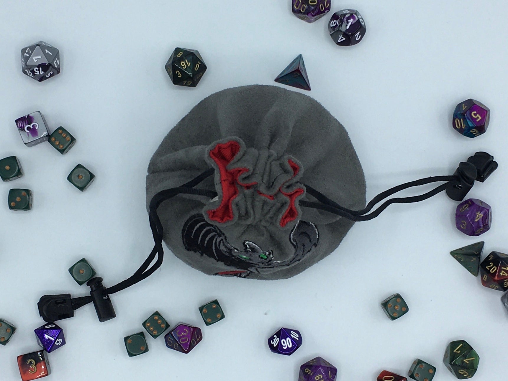 The soft satin cording for this bag is secured with a toggle lock and the ends are nicely finished with a zipper pull tab that won’t come undone. The outside is made of a soft faux suede you will love to touch. The pattern is embroidered directly onto the fabric. The inside is made of a sturdy twill that can handle whatever beating your dice can throw at it.
