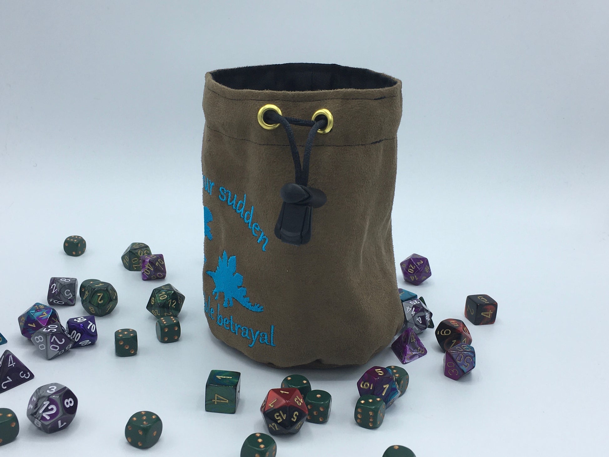The soft satin cording for this bag is secured with a toggle lock and the ends are nicely finished with a zipper pull tab that won’t come undone. The outside is made of a soft faux suede you will love to touch. The pattern is embroidered directly onto the fabric. The inside is made of a sturdy twill that can handle whatever beating your dice can throw at it.