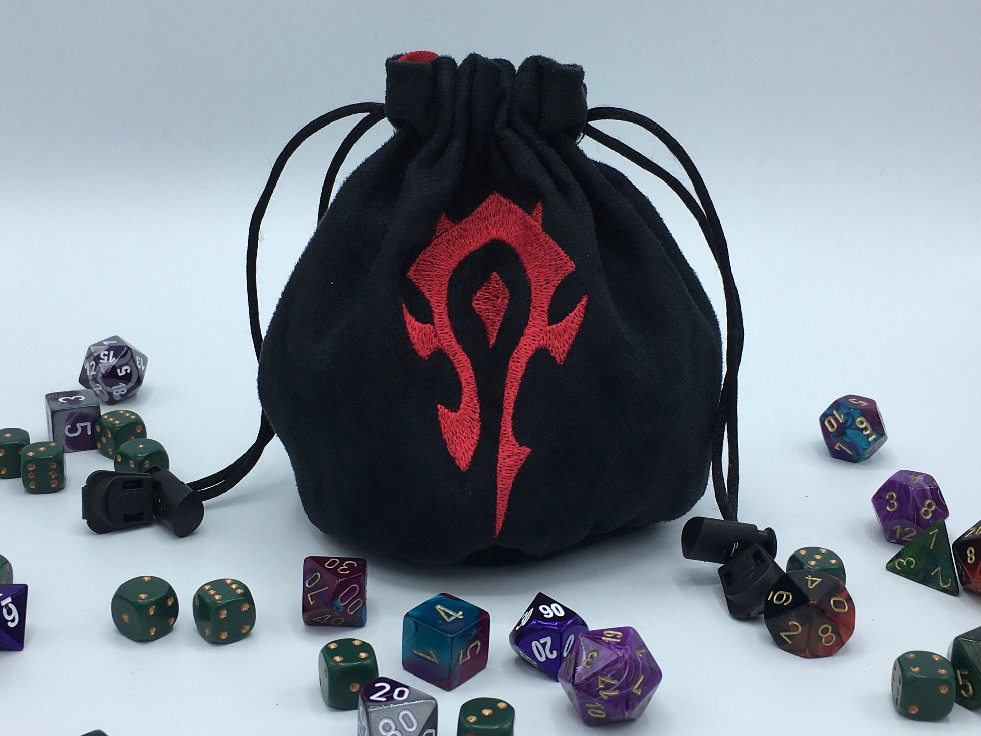 Carry your fate in style with this handmade Horde Embroidered Dice Bag. Crafted for gamers who dare to dominate, it features bold Horde insignia embroidery to showcase your allegiance. Durable and compact, it keeps your dice safe and ready for every critical roll, making it the perfect companion for all your WoW adventures.