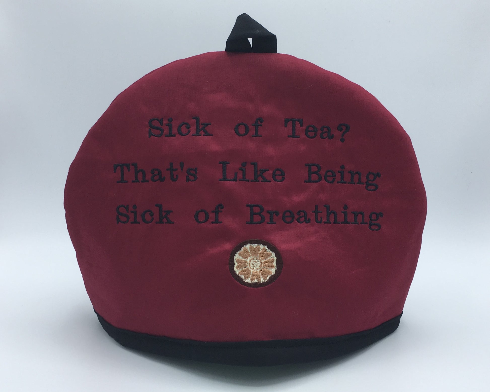The front is embroidered cotton, the back is quilted for stability. The middle layer is a heat reflective material to keep all of that heat pointed where we want it, at your tea. The interior is lined with a soft fleece to keep your pot even cozier.