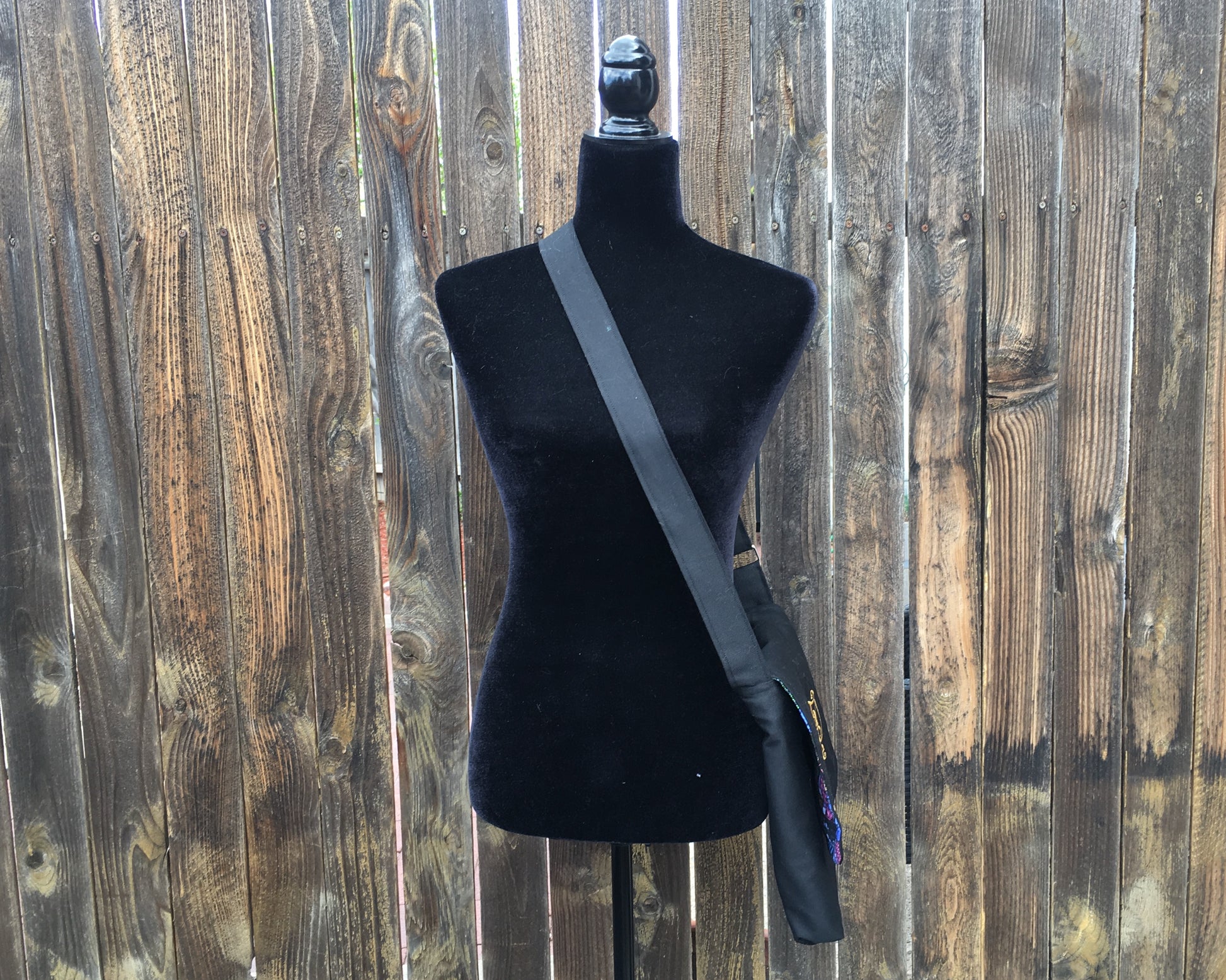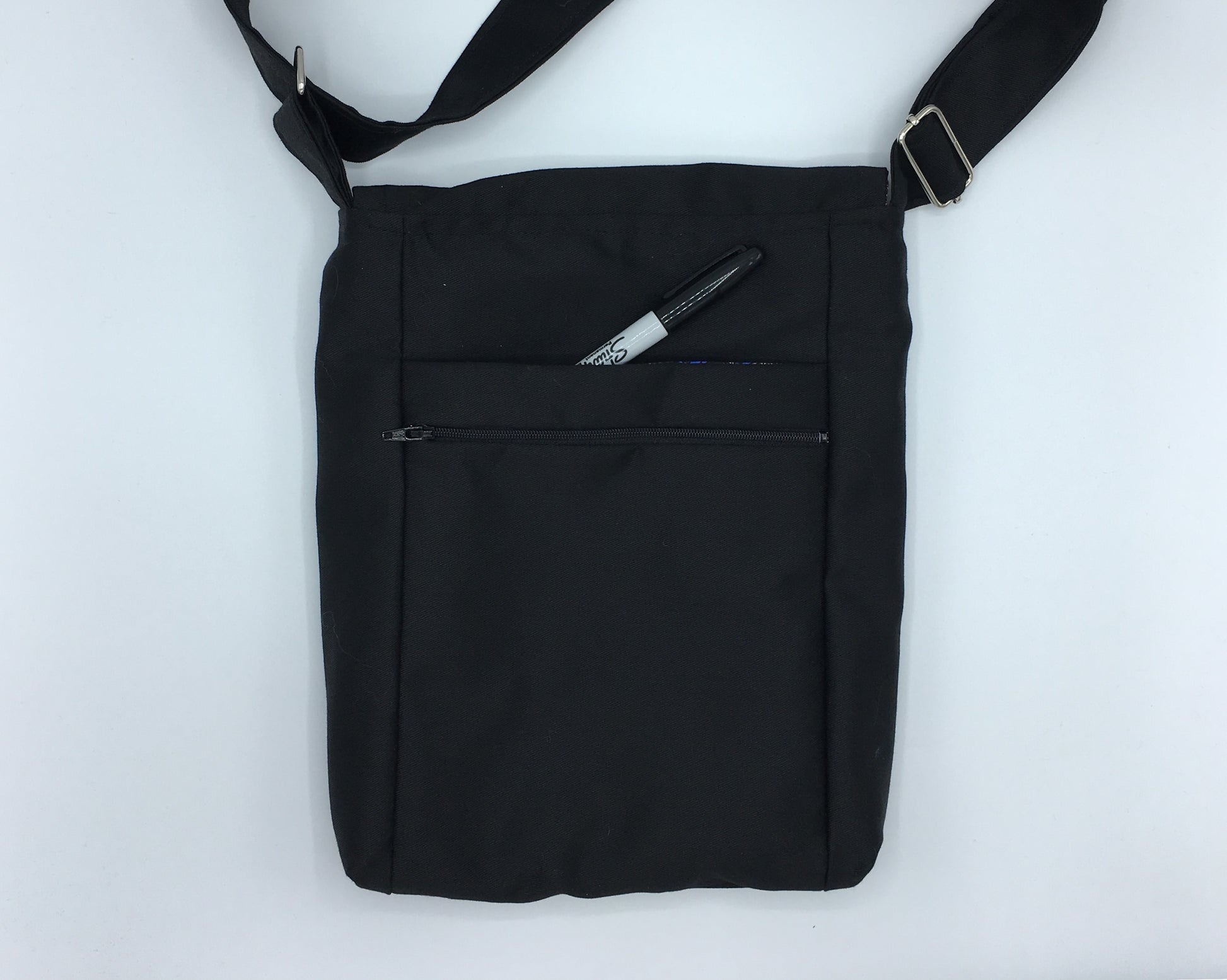 It is built out of sturdy twill and lined with reinforced cotton to handle the wear and tear of a heavy use purse. The main flap is covered in fantastic geeky embroidery. The strap is adjustable to fit your body and has been quilted for your comfort. It has eight pockets. I can easily fit a paperback in the outside slip pockets, and my iPad in the main compartment.