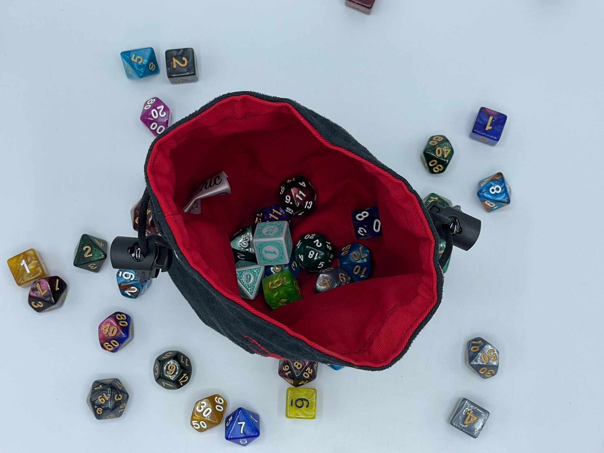The soft satin cording for this bag is secured with a toggle lock and the ends are nicely finished with a zipper pull tab that won’t come undone. The outside is made of a soft faux suede you will love to touch. The pattern is embroidered directly onto the fabric. The inside is made of a sturdy twill that can handle whatever beating your dice can throw at it.